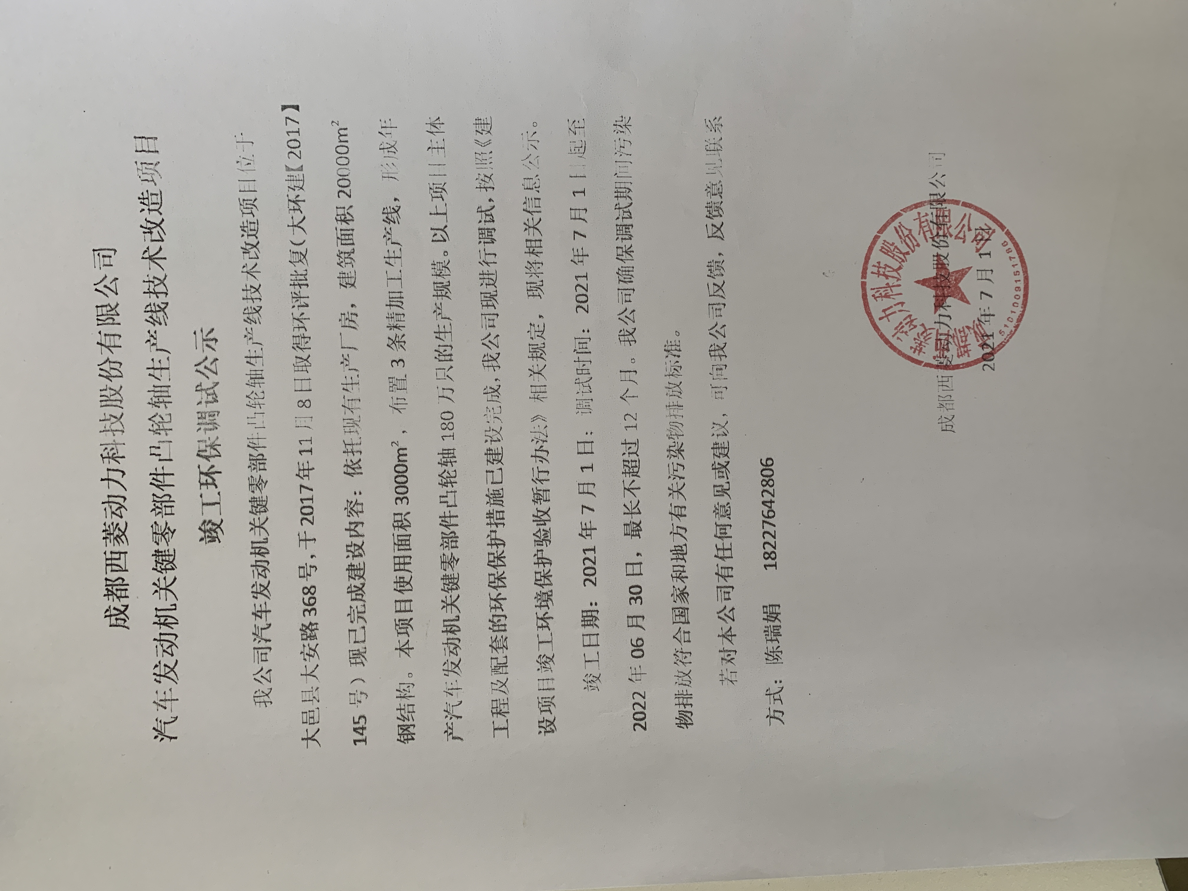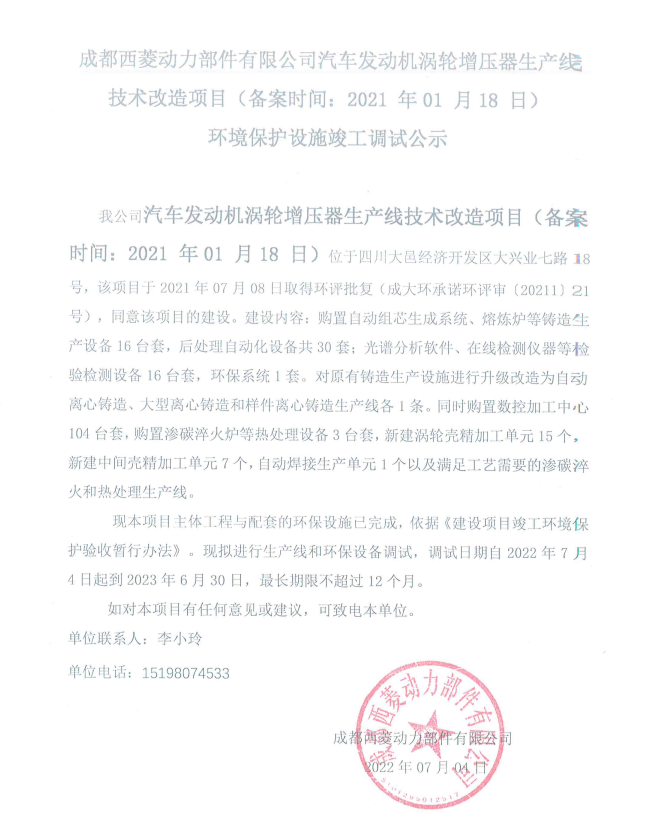 成都西菱動力科技股份有限公司汽車發(fā)動機(jī)關(guān)鍵零部件凸輪軸生產(chǎn)線技術(shù)改造項目竣工環(huán)保調(diào)試公示